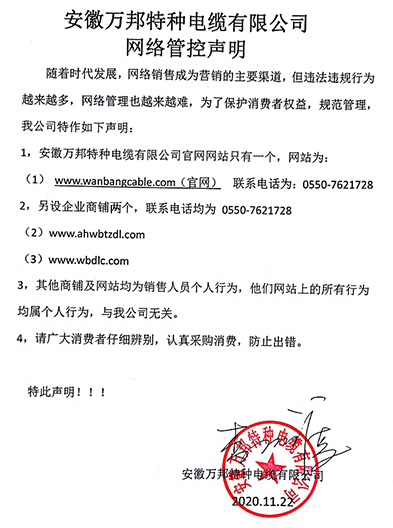 鄭重聲明:安徽萬邦特種電纜有限公司官方網站為:www_wanbangcable_com.aalamqp.cn,除此之外無任何子網站或合作網站,其余均為假冒偽劣。電話:0550-7621728 13485756353 地 址:安徽省天長市滁州高新技術產業開發區經四路29號